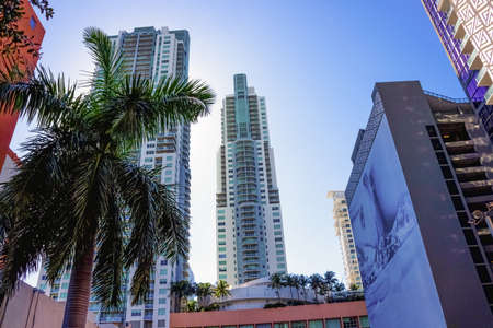 Miami, USA - November 30, 2019: Downtown Miami cityscape view with condos and office buildings against blue sky.