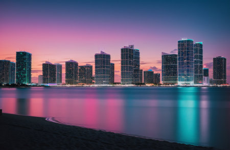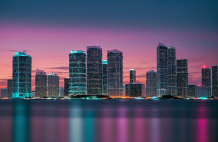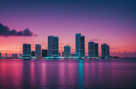 Miami Beach skyline at dusk with urban skyscrapers in Florida.