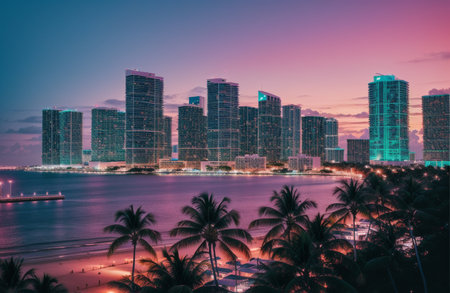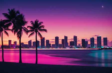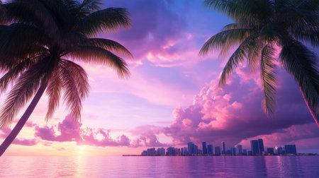 Stunning cityscape featuring vibrant colors of sunset over the ocean, framed by palm trees and shimmering skyline, perfect for travel and lifestyle themes.
