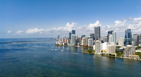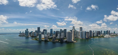 Aerial panorama of Brickell in Miami. Downtown Miami skyline on a sunny day. Scenic view of Miami Beach and Brickell. Miamis Skyscrapers. Brickell famous landmarks. Miami downtown landscape.