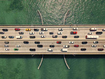 Top aerial view of the causeway. Key Biscayne bridge. Draw bridge with cars passing. Broad Causeway Bridge spans Biscayne Bay. Connecting town of Bay Harbor Islands to mainland Miami