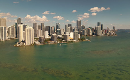 Aerial view of Brickell skyscrapers. Modern cityscape of downtown Miami. Panoramic Miami skyline above the coastline. Brickell Key aerial view in Miami.