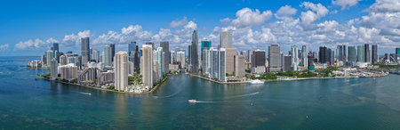 Panorama of Brickell in Miami. Panorama of Miami skyline on a sunny day. Panorama view of Miami Beach and Brickell. Brickell famous panorama. Miami downtown landscape.