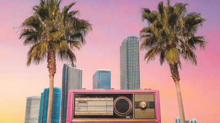Old-school radio with vibrant colors playing music in the background, palm trees and a city skyline at sunset, capturing an urban vibe with retro aesthetics. --chaos 30 --ar 16:9 --v 6.1 Job ID: a64bcfa0-dc1b-44a0-9180-f80073499372