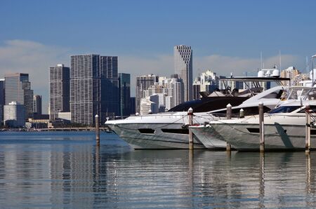 Luxury recreational boats moored at a marina on Key Biscayne,Florida with Brickel Avenue condos in Miami in the background