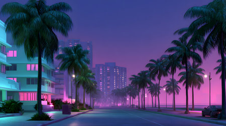 Urban street scene showcases palm trees along the road, with colorful buildings glowing in neon lights, creating a lively ambiance perfect for evening walks