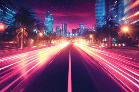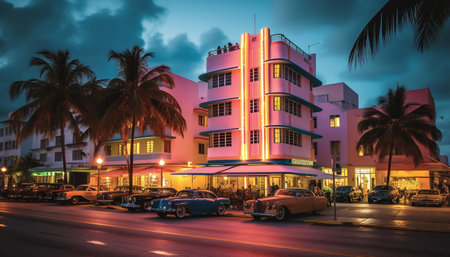 Luxury cars speed through Miami nightlife streets generated by artificial intelligence