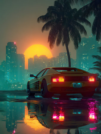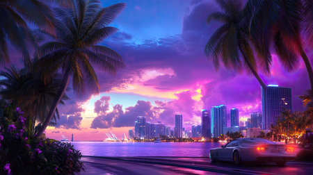 Experience a vibrant neon sunset with a vintage car parked beside a city skyline. Palm trees frame the scene, reflecting colorful lights on water.