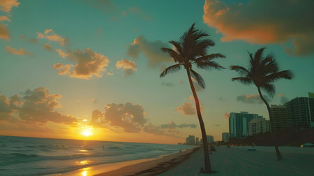 A breathtaking sunrise over Miami Beach, Florida, with palm trees silhouetted against a vibrant sky.
