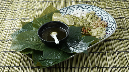 Thai appetizer called Miang Kham, some of nutritious snack wrapped in leaves with a sweet and salty sauce is a traditional Southeast Asian snack from Thailand