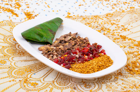 Miang kham: A royal leaf wrap appetizer a traditional from Thailand. Thai herbal appetizer wrapping consisting of dried shrimp, roasted coconut, beans, ginger, lime and chili.