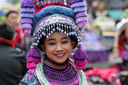 Nan, Thailand - DECEMBER 22, 2011: Portrait of a little Hmong tribe girl in traditional clothing during Hmong New Year’s celebration. Khun Sathan.