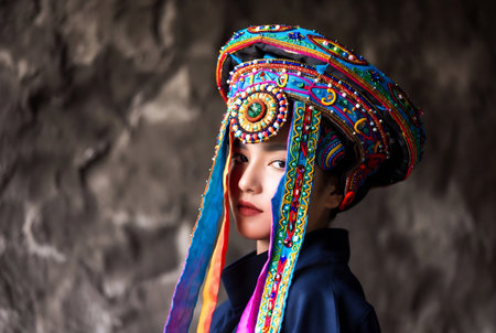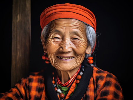 Portrait of a smiling asian woman wearing an intricate, colorful ethnic headdress