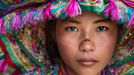 Close-up portrait of a woman adorned with colorful hmong headwear