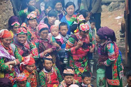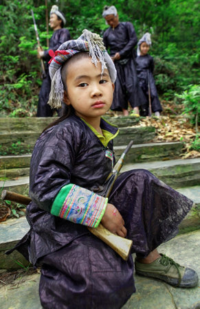 GUIZHOU, CHINA - APRIL 10: Ethnic Minorities, Chinese boy at the age of 8 years old, in traditional ethnic clothing Miao tribe, holding an old musket, April 10, 2010. Basha Village, Congjiang County.
