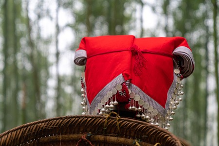 Closeup of red hat of Vietnamese ethnic minority Red Dao women in Lao Cai, Vietnam
