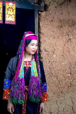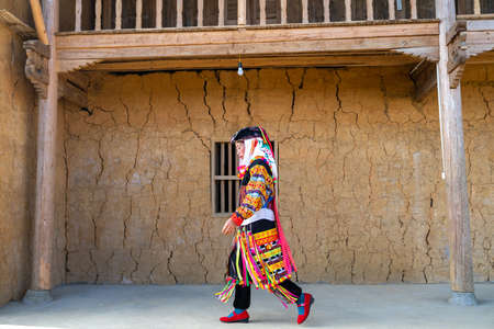 Ha Giang, Vietnam - Nov 26, 2018: Lo Lo ethnic minority woman in traditional costume with old wall-thicked house at Lo Lo Chai village, Dong Van district