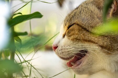 A tabby kitten meowing, closeup, closeup, summer concept.