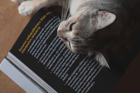 A cute gray cat is lying on a soft bed with its owner, who is reading an old interesting book. Cozy pastime with a pet at home.