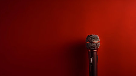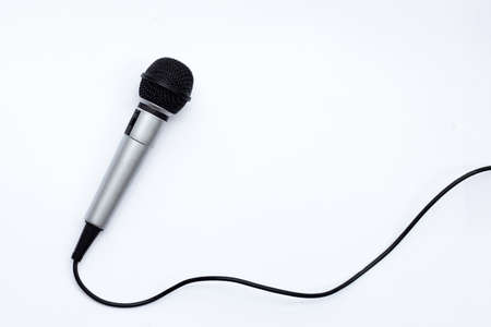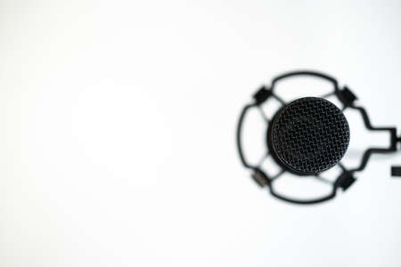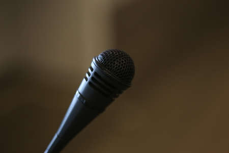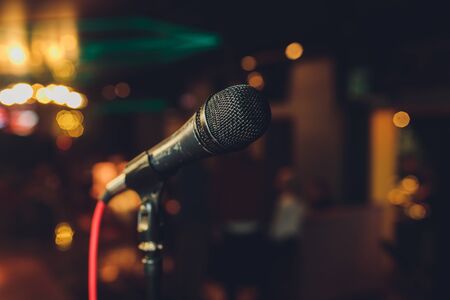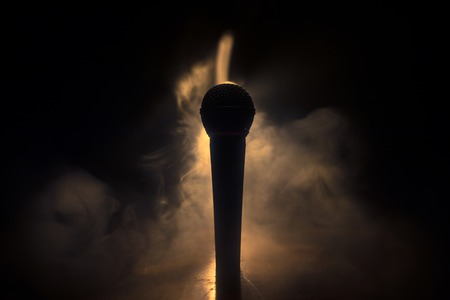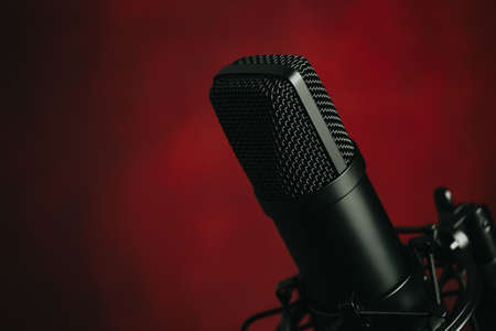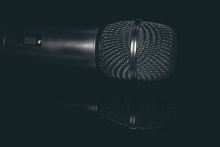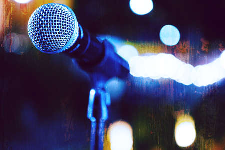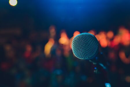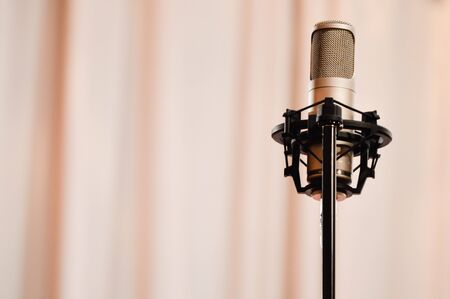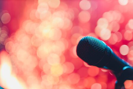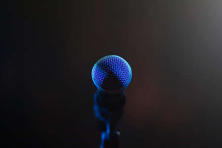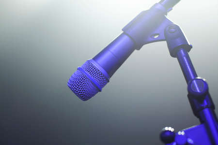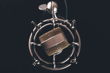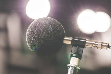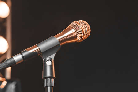 Microphone for sound, music, karaoke in audio studio or stage. Mic technology. Voice, concert entertainment background. Speech broadcast equipment. Live pop, rock musical performance