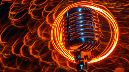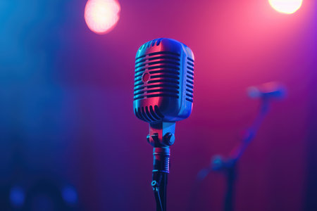 A close-up of a vintage microphone on a stand, with a spotlight highlighting its classic design, evoking a sense of nostalgia and elegance in a music performance.