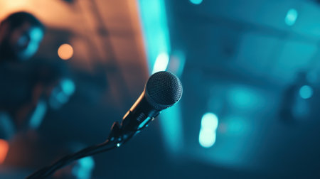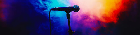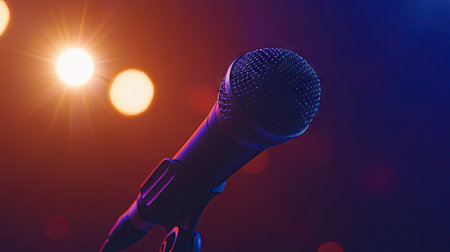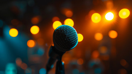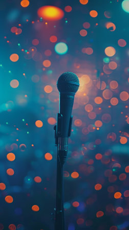 Microphone on stage with colorful bokeh lights, vibrant atmosphere. Music and performance concept