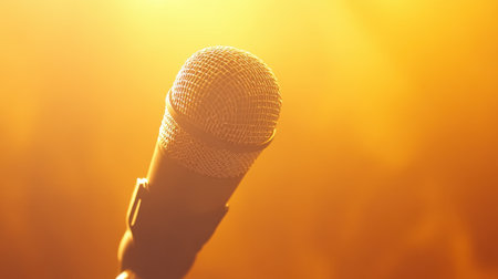 This image features a close-up of a microphone set against a warm golden background. Soft lighting creates an inviting atmosphere, perfect for showcasing music or performance themes.
