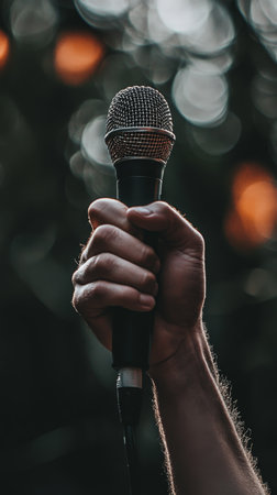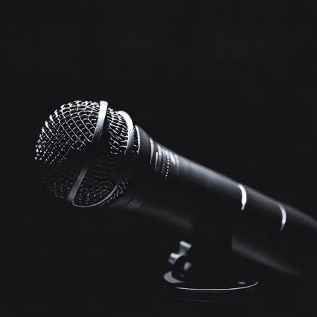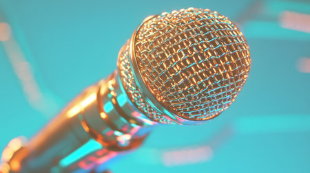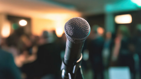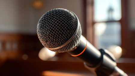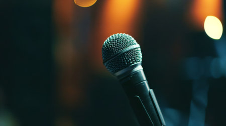 Close up view of microphone, showcasing its textured surface and metallic finish, set against softly blurred background. image conveys sense of anticipation and readiness for performance or speech
