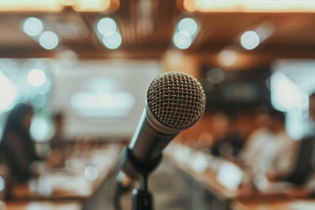 Microphone close up shot in seminar or meeting room with people in blur focus.