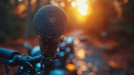 Close-up of a microphone mounted outdoors with warm sunset lighting and blurred forest background.