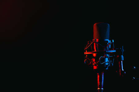 studio microphone banner with red and blue neon lights. space for text. 3d rendering