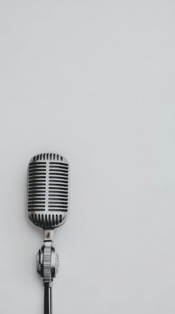 Classic microphone standing ready to capture sound, invoking nostalgia for the golden age of broadcasting and recording, perfect for music, podcasts, and live performances