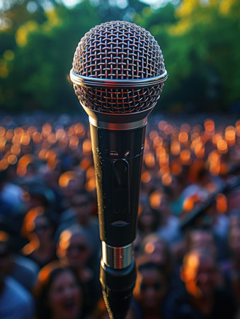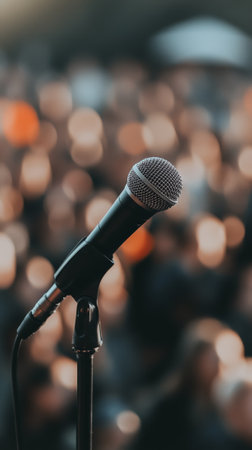 Microphone positioned on stage, awaiting the arrival of a singer or speaker, ready to engage a large, blurred audience filled with anticipation for the upcoming performance