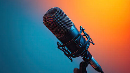 Professional condenser microphone on a stand, ready for recording, against a bold gradient backdrop.