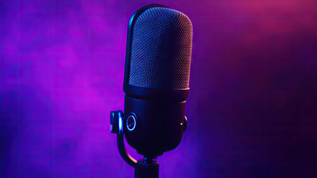 Podcasting microphone with soft LED lights, creating a futuristic glow against a purple backdrop.