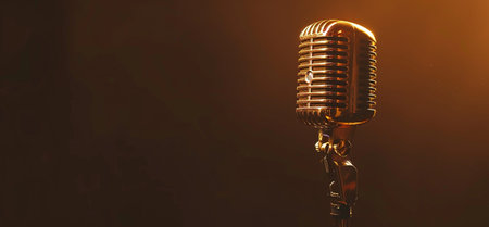 A classic retro microphone with a gold finish is illuminated by a warm spotlight against a dark, moody backdrop.