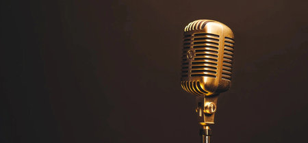 A classic vintage gold microphone is showcased against a dark, moody background, emphasizing its iconic design and retro appeal.