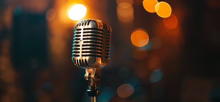 A gleaming vintage chrome microphone rests on a stand, bathed in the warm glow of soft, out-of-focus lights, evoking a sense of nostalgia.