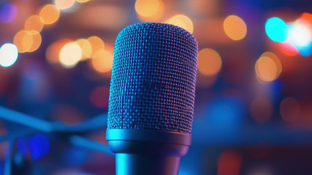 This image features a close-up view of a professional microphone, showcasing its texture and design against a backdrop of vibrant, blurred lights, ideal for creative projects.