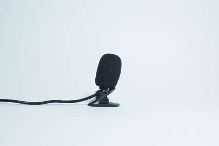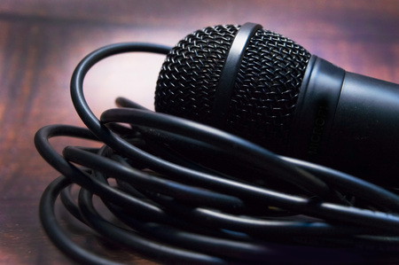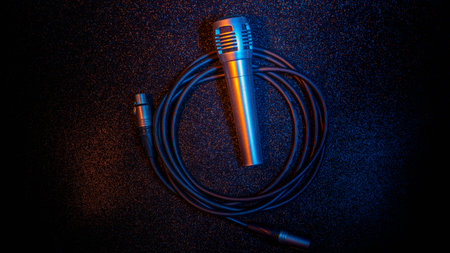 The microphone connected with cable on abstract blurred of light in the studio, speaking conference hall light or podcast recording. Event Background. Copy space on the left.