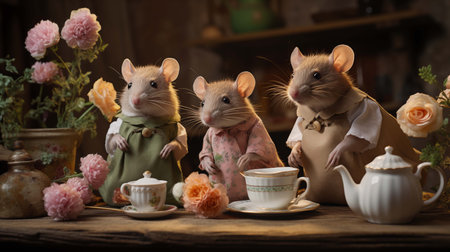 Three elegant mice host delightful floral tea party ai generated anthropomorphic scene. Vintage attire rodents rustic animals humanlike image fantasy. Fairytale ambiance concept picture photorealistic