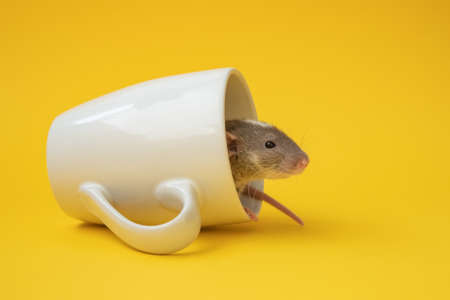 Small cute mouse in cup on yellow background