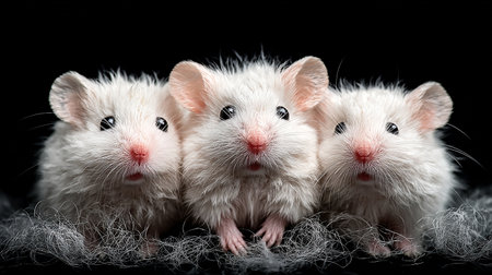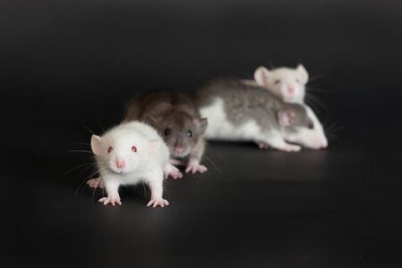 Three little white rats on a black background. Close-up.