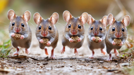 A charming scene capturing five mice energetically running together on a natural path, each holding an acorn, showcasing their playful nature and vibrant environment.