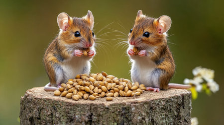 Two charming brown mice are perched on a tree stump, happily eating seeds in a serene outdoor setting, showcasing their playful and cute demeanor.