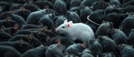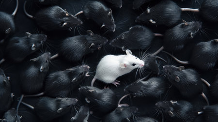 A single white rat stands out among many black rats, symbolizing uniqueness or difference.
