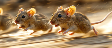 A charming scene of playful baby mice running energetically across straw in a barn, showcasing their adorable nature and lively spirit amidst a rustic setting.