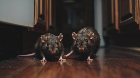 Two brown rats explore a wooden kitchen floor, showcasing their natural curiosity. The close-up captures their details, highlighting their fur and environment.