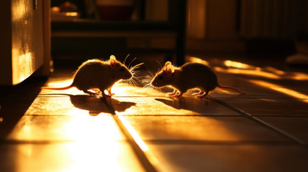 Two small mice interact playfully on a tiled kitchen floor, bathed in warm evening light. Their adorable features and shadows create a charming scene.