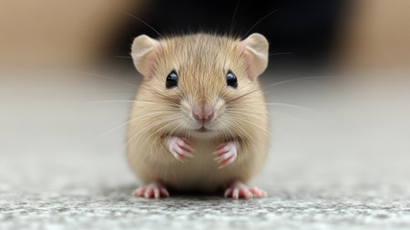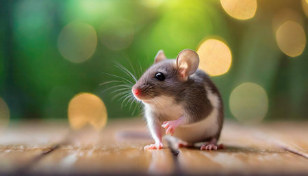 Tiny mouse on wooden floor. Small rodent. Close-up image with soft focus and bokeh background.